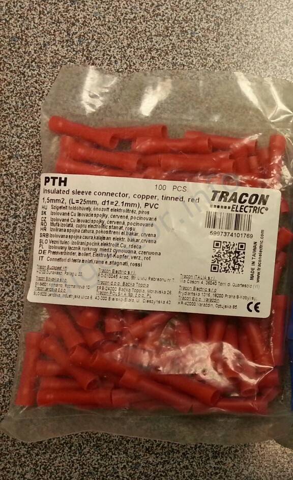 Dutinka SPOJKA PTH Červená 1.5mm2 Izolovaná, L=25/2mm, Cu+Sn/PVC, lisovacia